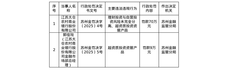 针对上述行为,苏州金融监管分局依据《中华人民共和国银行业监督管理法》第二十一条、第四十六条及相关审慎经营规则,对江苏太仓农村商业银行股份有限公司罚款70万元。郭佳玫,时任江苏太仓农村商业银行股份有限公司金融市场部总经理,对公司超资质投资资管产品事项负有责任。苏州金融监管分局依据《中华人民共和国银行业监督管理法》第二十一条、第四十八条及相关审慎经营规则,对郭佳玫罚款9万元。